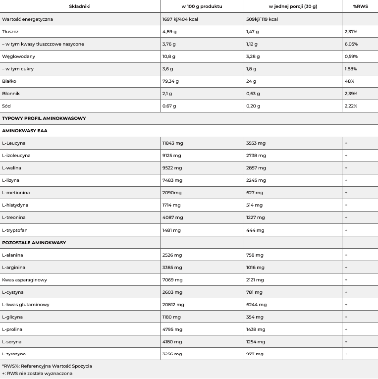 Jakość surowca to wysoka biodostępność i możliwe wysokie wsparcie budowy masy mięśniowej.
